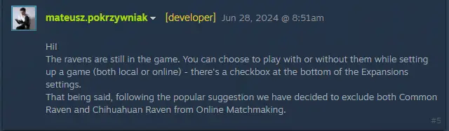 Update 11/26/25: It was pointed out to me on Reddit, and I later confirmed with a google search, that Ravens are automatically removed from the deck when players use online matchmaking. Here is a comment from a developer on the Steam forums.